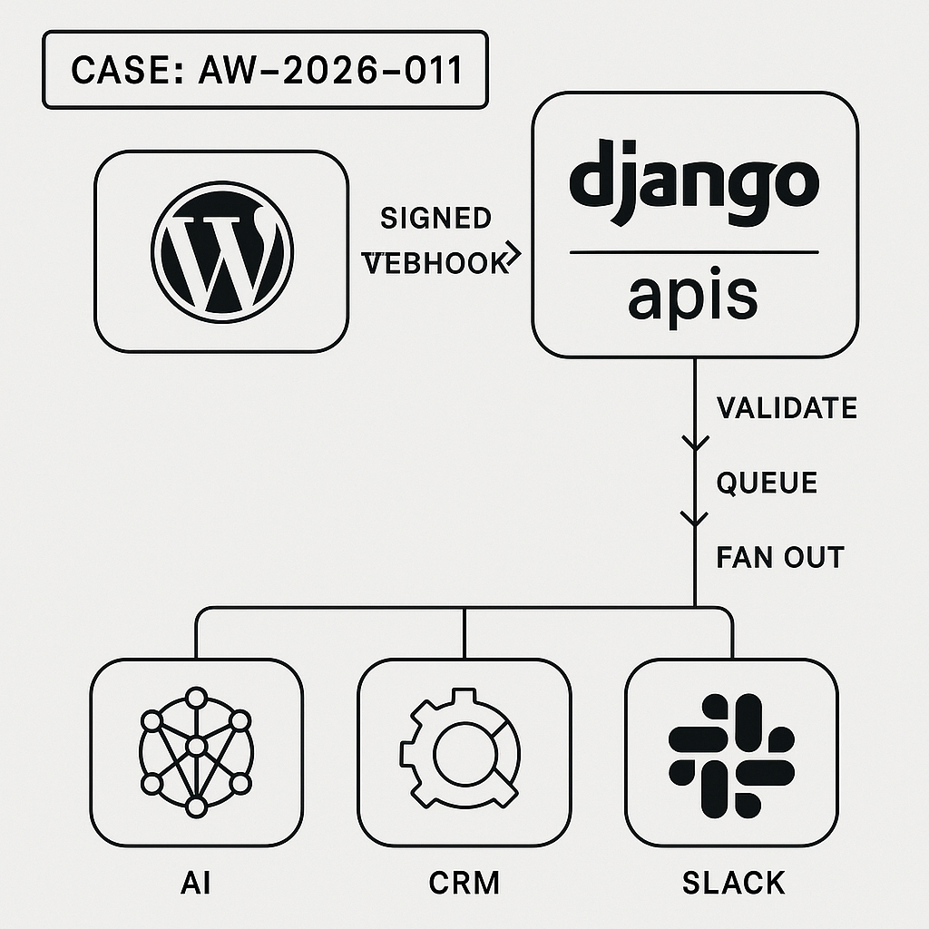 Move WordPress events (form leads, orders, comments) to external AI/CRM services reliably and securely using a Django gateway. Avoid direct browser-to-API calls, centralize secrets, add validation, idempotency, and backpressure.