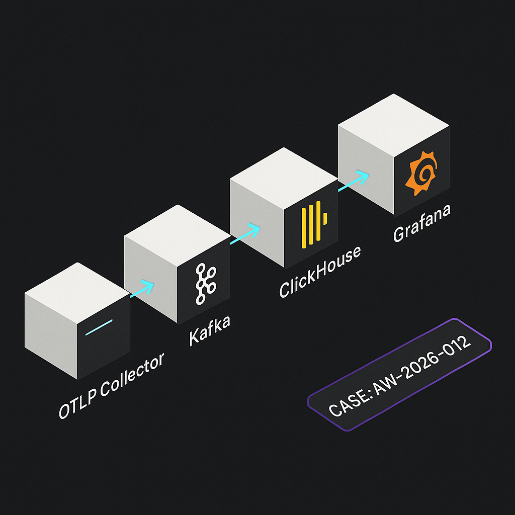 – Services: otel-collector, kafka, zookeeper, clickhouse-server, clickhouse-init (one-shot DDL), grafana.