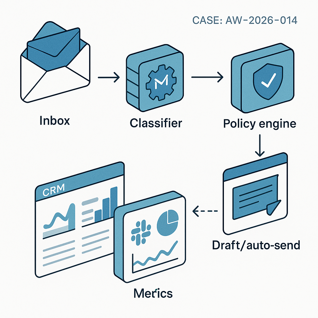 – Policy engine: JSON rules for sender allowlists, domains, SLAs, PII handling