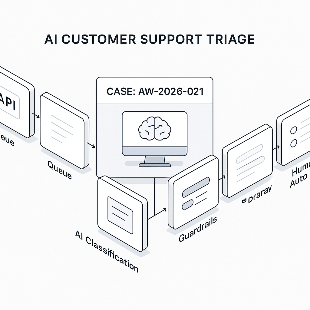 This post shows how to ship a production-ready AI triage layer for customer support. The system auto-classifies tickets, suggests or sends replies, and routes escalations with auditable logs. It’s event-driven, API-first, and designed to be cheap, measurable, and safe.