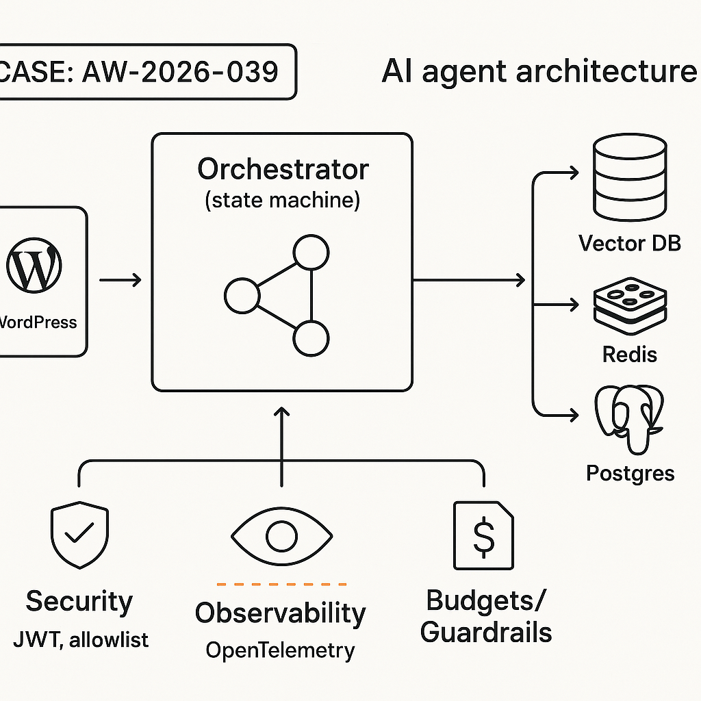 – Integration: WordPress plugin sends chat events to orchestrator; streaming tokens back to UI.
