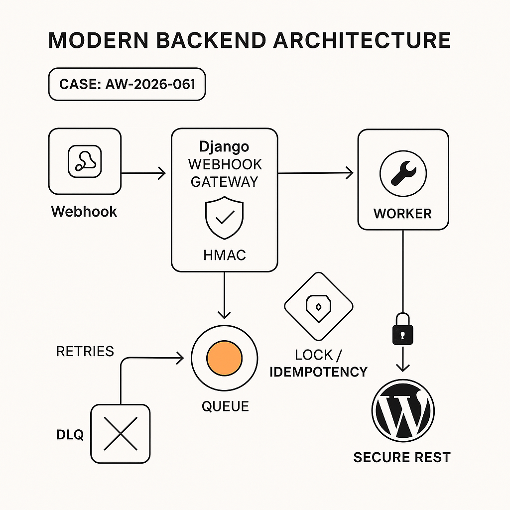 This pattern keeps webhook security, reliability, and performance centralized, while WordPress remains a clean, fast presentation and light business layer. It’s battle-tested for multi-tenant automations and scales with your traffic.